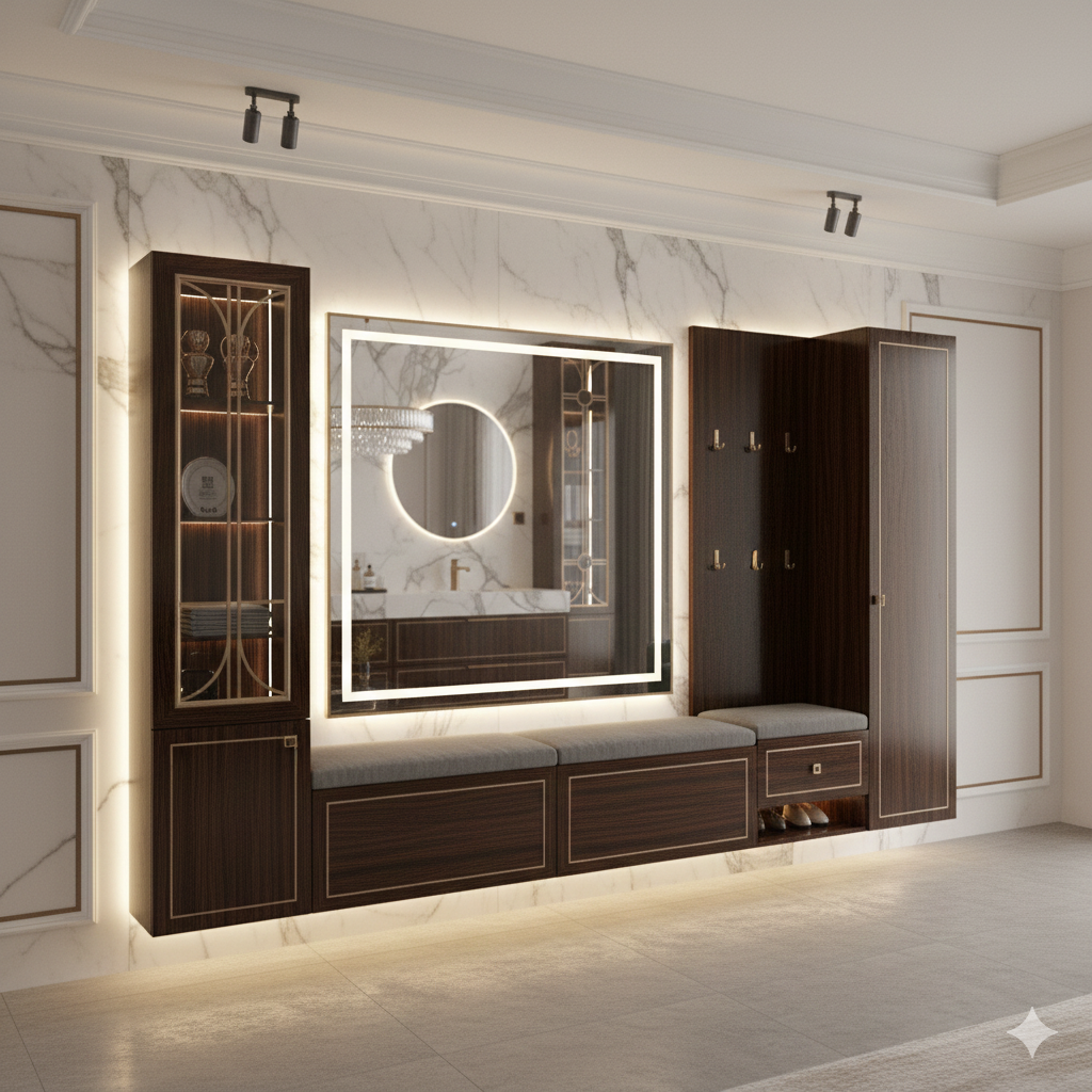 Giriş holü için şık ve fonksiyonel portmanto takımları. Siparişe göre malzeme seçimi esnekliği (Lake, Akrilik, Membran).