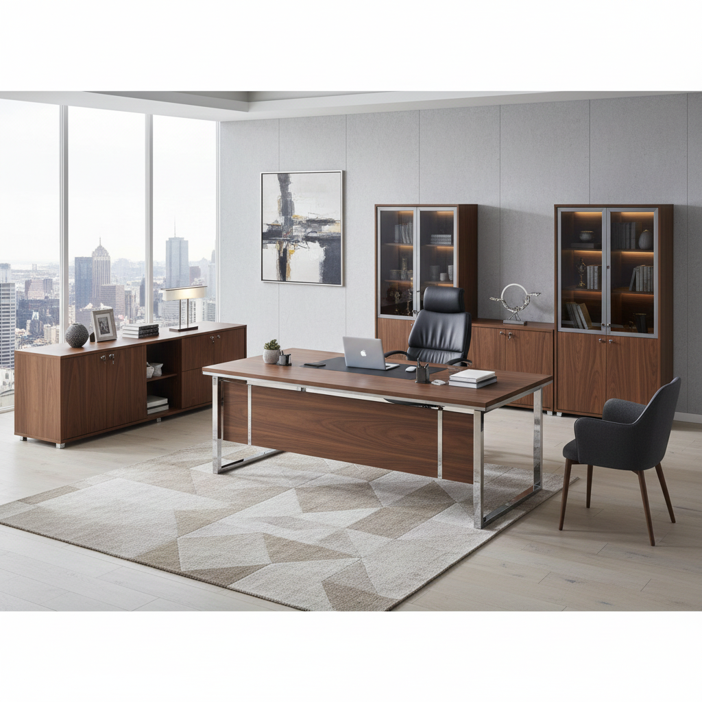 Komplet ofis takımı. Masa, koltuk ve dolap ile tam çalışma ortamı. Siparişe göre malzeme seçimi esnekliği (Lake, Akrilik, Membran).